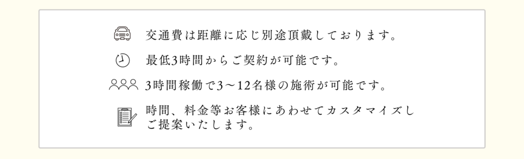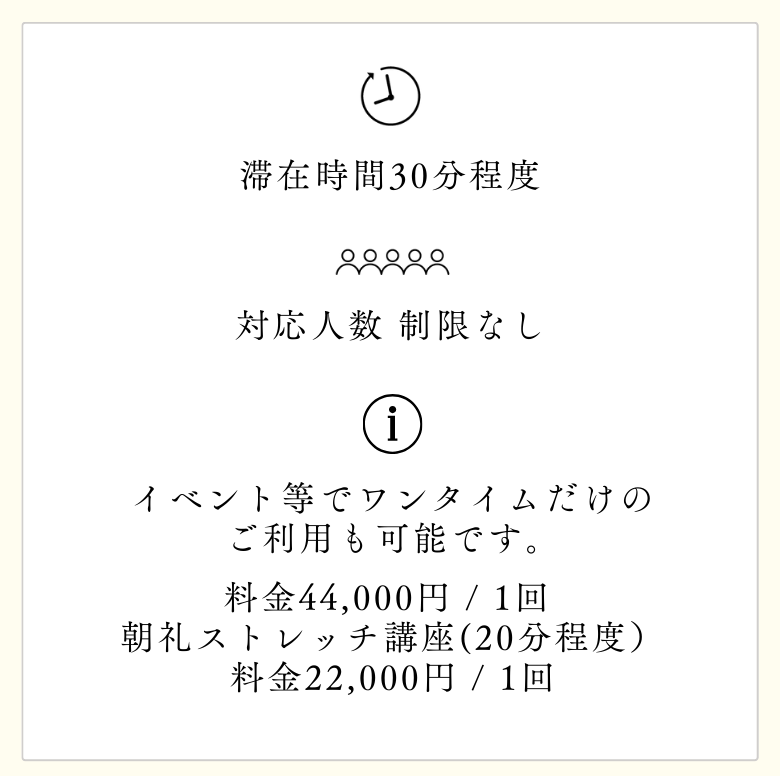 福利厚生ご担当者さまへ こんなお悩みありませんか? そのお悩み、e-faceが解決します。 導入のメリット 従業員様の健康維持・生産性向上離職率低下・採用コストダウン福利厚生充実のお手伝い 導入のメリット 従業員様の健康維持・生産性向上 離職率低下・採用コストダウン 福利厚生充実のお手伝い Point01 従業員様の健康維持 生産性向上 日々の業務で疲れた身体に対してストレッチを受けていただくことにより、肩こり・腰痛などを緩和し、従業員様の健康を維持します。 Point02 離職率低下採用コストダウン 「社長が社員のためにと導入してくれて嬉しかった」「他社にはあまり無い福利厚生サービスで嬉しい」ということで離職率を下げることが出来れば、採用のコストダウンも望めます。また採用時のPRになります。 Point03 福利厚生充実のお手伝い 「社員採用ホームページの福利厚生欄に社内専属ストレッチサービス」を記入する事で、採用の後押しになったという声もいただいております。 オフィスストレッチ導入企業が増加する中 e-faceが選ばれる理由 身体のメンテナンスだけでなく、ダイエット資格を保有しているトレーナーが 健康的なお身体作りのエクササイズをサポートいたします。 01 複数の認定資格取得者が専属でサポート ストレッチ、整体、ダイエットなど、身体に関する様々な資格を保有し、お悩みに合わせた多方面からのアプローチが可能です。また、個人店ならではのマンツーマン指導を通じて、長期的な体のサポートを提供しています。 02 小スペース&短時間で導入可能! 専用の施術ルームは不要!空いているスペースがあれば、どこでも施術が可能です。休憩時間などのちょっとした隙間時間でも、すぐにリフレッシュしていただけます。 03 スポーツ選手とのスポンサー契約 e-faceは、競輪選手である「牧田咲子選手」とスポンサー契約を締結しています。日頃からプロアスリートの身体のメンテナンスを担当しており、競技者からも高い信頼をいただいています。 01 複数の認定資格取得者が専属でサポート ストレッチ、整体、ダイエットなど、身体に関する様々な資格を保有し、お悩みに合わせた多方面からのアプローチが可能です。また、個人店ならではのマンツーマン指導を通じて、長期的な体のサポートを提供しています。 02 小スペース&短時間で導入可能! 専用の施術ルームは不要!空いているスペースがあれば、どこでも施術が可能です。休憩時間などのちょっとした隙間時間でも、すぐにリフレッシュしていただけます。 03 スポーツ選手とのスポンサー契約 e-faceは、競輪選手である「牧田咲子選手」とスポンサー契約を締結しています。日頃からプロアスリートの身体のメンテナンスを担当しており、競技者からも高い信頼をいただいています。 サービス内容 e-faceでは、3つのサービスをご用意しています。 PLAN1 オフィスストレッチ 企業様のスペースをお借りし、 トレーナーが出張いたします。仕事の隙間時間に受けることで業務効率の生産性向上を目指します。 料金案内 PLAN2 回数券の販売 回数券を従業員の方に配布し、 e-faceの店舗でご利用いただけます。 料金案内 PLAN3 イベントの開催 「姿勢・肩こり腰痛改善ストレッチ」 「ダイエット・健康エクササイズ」をテーマにしたイベントの開催が可能です。 料金案内 PLAN1 オフィスストレッチ 企業様のスペースをお借りし、 トレーナーが出張いたします。仕事の隙間時間に受けることで業務効率の生産性向上を目指します。 料金案内 PLAN2 回数券の販売 回数券を従業員の方に配布し、 e-faceの店舗でご利用いただけます。 料金案内 PLAN3 イベントの開催 「姿勢・肩こり腰痛改善ストレッチ」 「ダイエット・健康エクササイズ」をテーマにしたイベントの開催が可能です。 料金案内 料金案内 PLAN1 オフィスストレッチ 1時間11,000円 内訳:コース料金6,600円+トレーナー派遣料金4,400円 導入例 1回4時間/月1回 月額利用料 44,000円 1回4時間/月2回 月額利用料 88,000円 1回8時間/月2回 月額利用料 176,000円 PLAN2 回数券の販売 店舗での通常料金 1回当たりの料金 50分コース 5,500円 60分コース 6,600円 PLAN3 イベントの開催 回数 料金 月1回 33,000円 月2回 66,000円 月4回 132,000円 お問い合わせは、こちらからお願いします。 お問い合わせフォーム 導入実績 株式会社 大平ファーム様より 福利厚生として導入いただいております。 導入までの流れ お問い合わせ ご面談もしくは郵送で資料送付 ご契約 まずは、お問い合わせフォームからお気軽にご連絡ください。 お客様の状況を詳細にお伺いします。郵送でも資料をお渡し可能です。 ご面談後、問題がなければ正式に契約書の記入をお願いしています。 お問い合わせ まずは、お問い合わせフォームからお気軽にご連絡ください。 ご面談もしくは郵送で資料送付 お客様の状況を詳細にお伺いします。郵送でも資料をお渡し可能です。 ご契約 ご面談後、問題がなければ正式に契約書の記入をお願いしています。 よくある